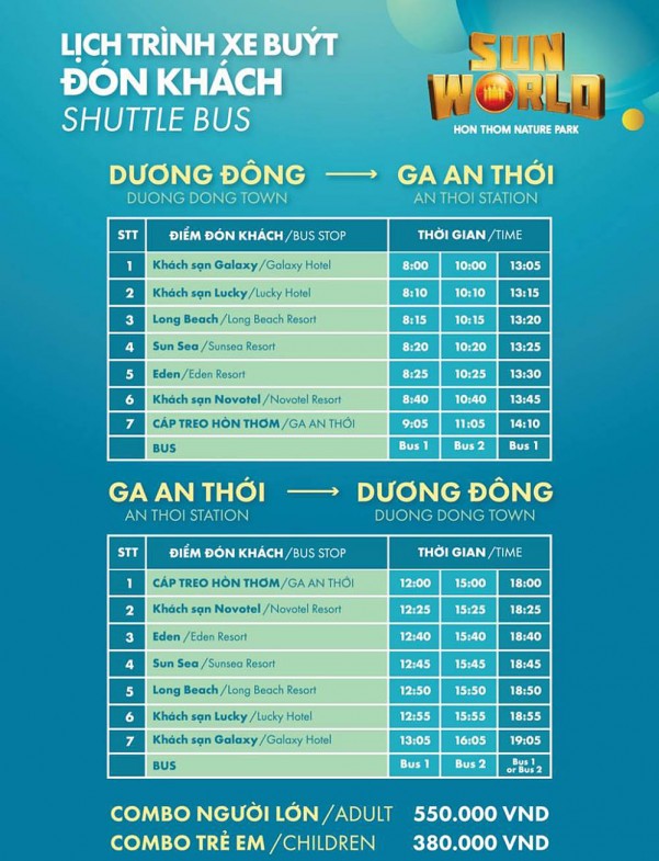 Để dễ dàng cho du khách trong việc đi lại, bắt đầu từ ngày 17/05/2018 tuyến xe buýt Sun World Phú Quốc chính thức được đưa triển khai với 2 tuyến cùng 3 điểm đón và trả khách